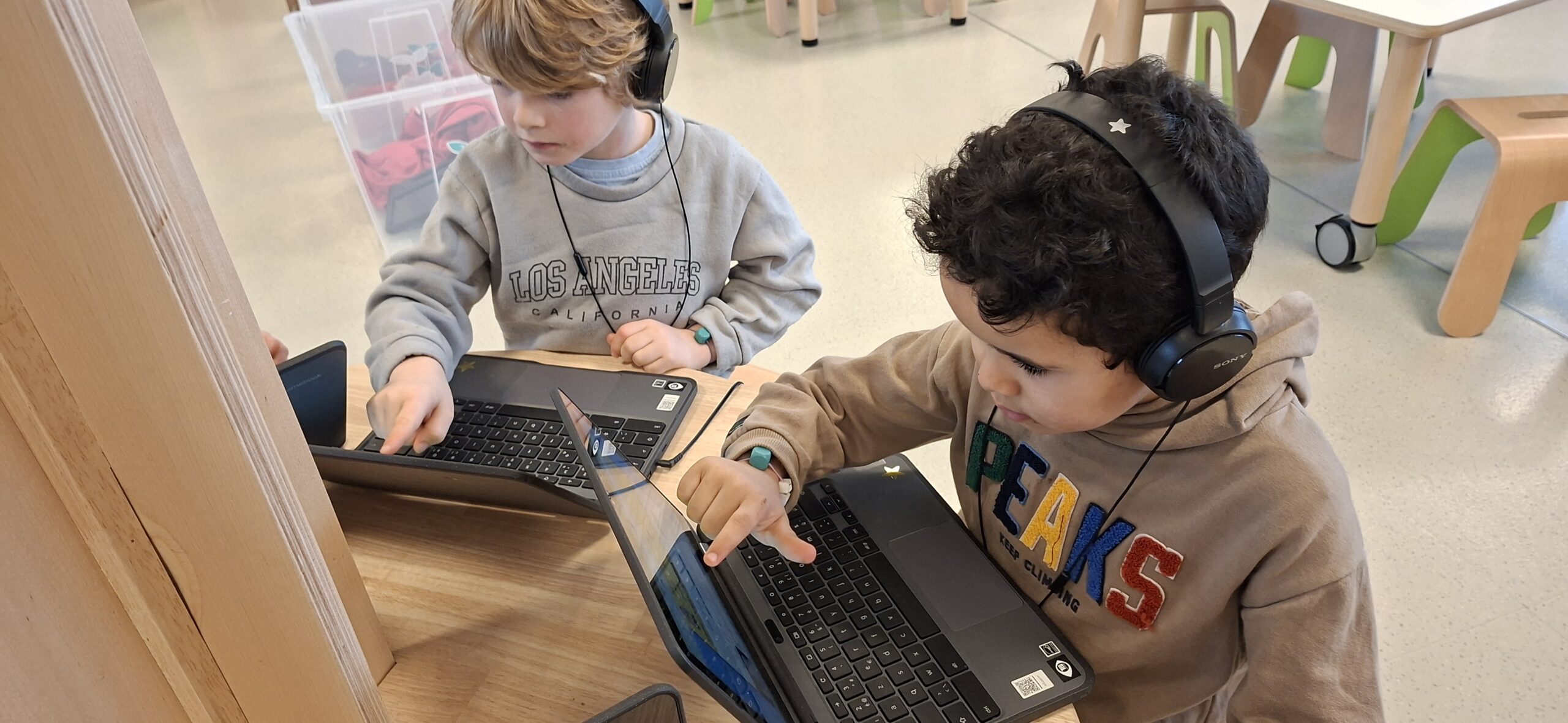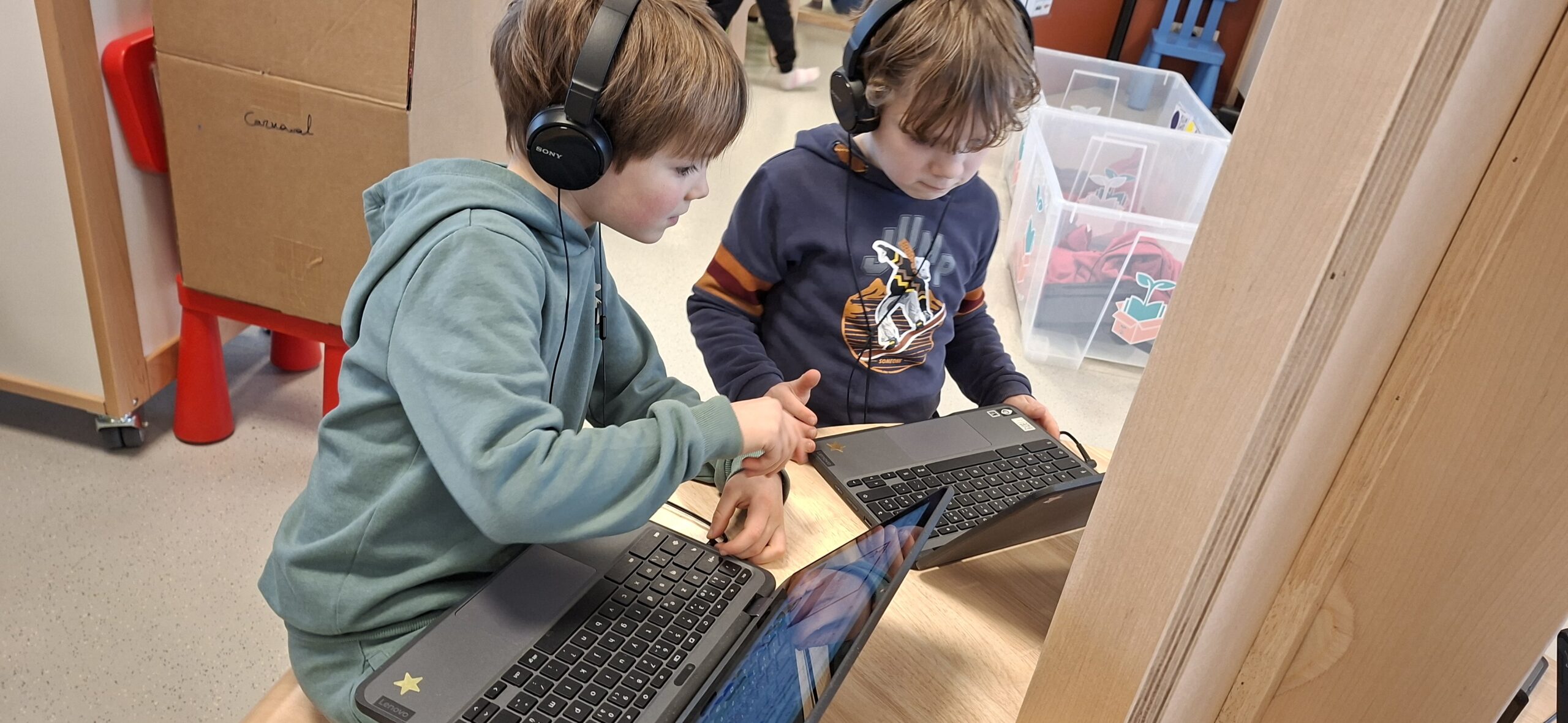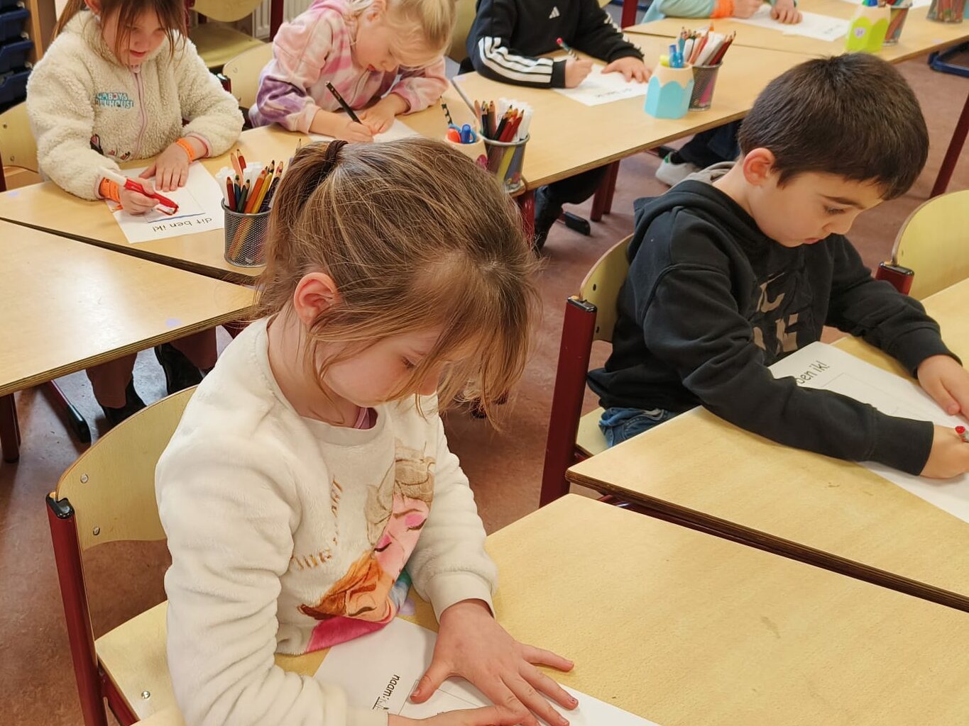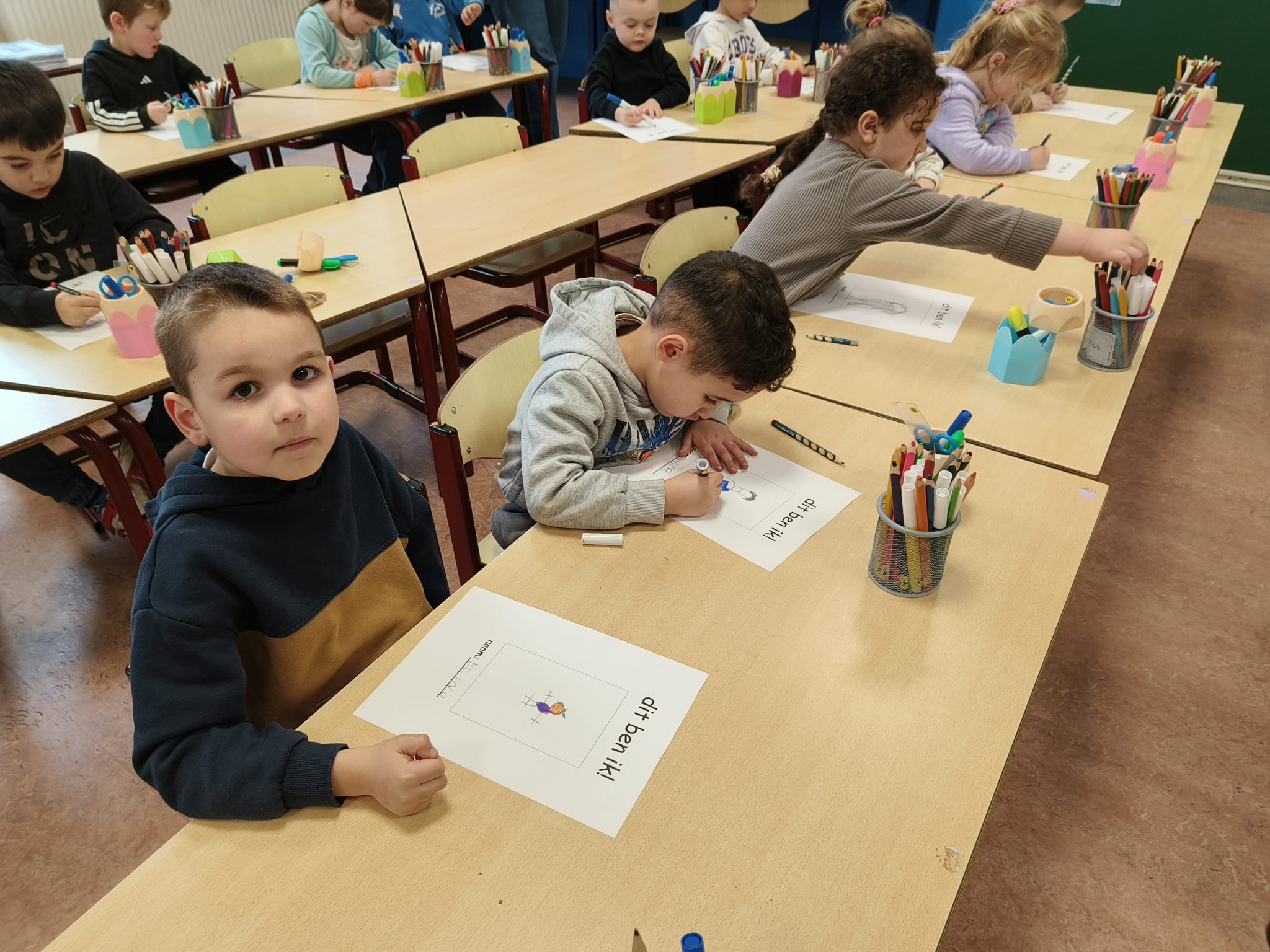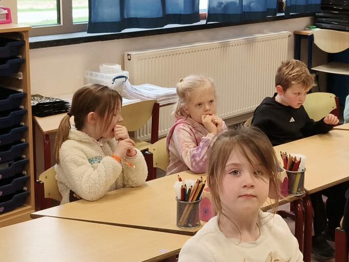 We gingen deze week ook voor de eerste keer naar het eerste leerjaar. Het doel was vooral om de juf en haar klas te leren kennen. Maar ook de juf wilt ons natuurlijk al wat beter leren kennen. We mochten vertellen aan mol en beer, dat worden onze talige vriendjes in het eerste leerjaar. En daarna tekenden we onszelf met enkele dingen die wij graag hebben en die we zelf passend vinden bij onszelf. Het eerste leerjaar ging ondertussen nog eens terug naar onze klas. Zij vonden het ook heel erg leuk, maar tegelijk ook wel wat kort. Beide groepen kijken al uit naar onze volgende afspraak, die in maart zal doorgaan.