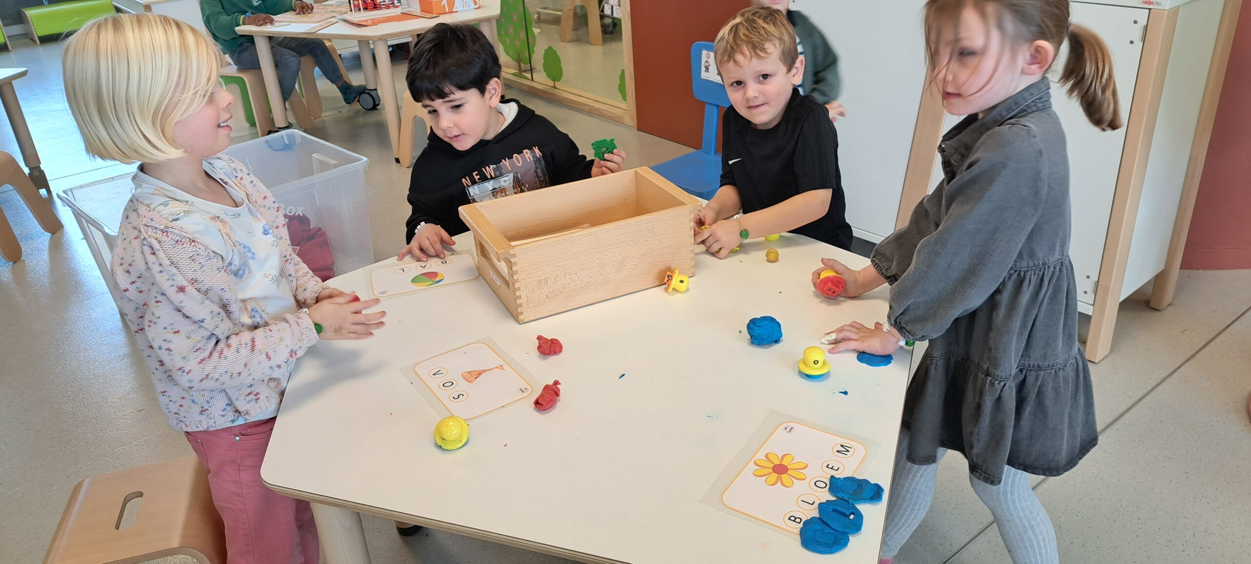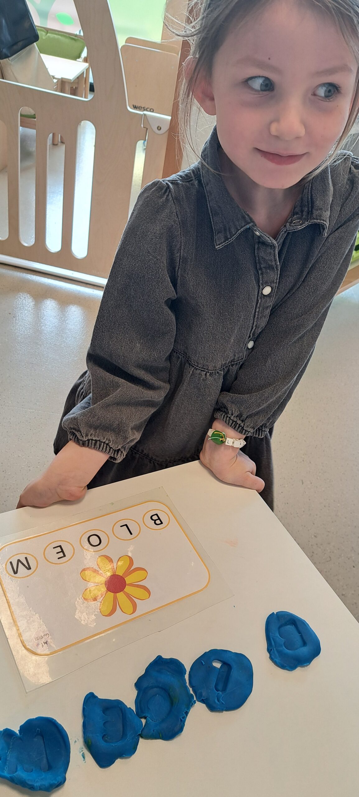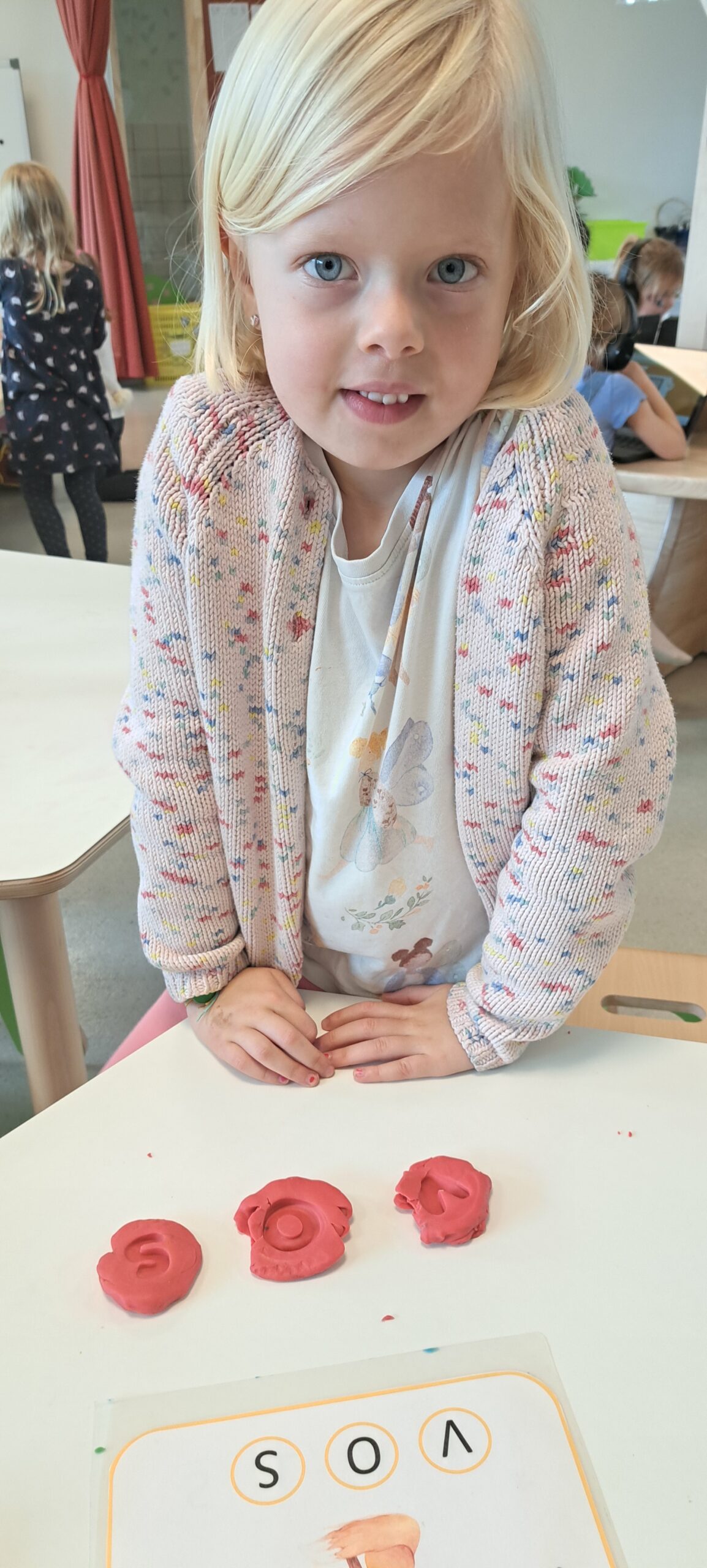 In de knutselhoek mochten we een prent kiezen in het thema van Halloween. De juf tekende op de achterzijde enkele lijnen, waarop we moesten knippen. Onze prent was nu in stukken… Daarna moesten we de prent terug tot 1 geheel proberen te maken en kozen we een gekleurd papier als achterkant. Wie wou, mocht achteraf ook nog de prent versieren. In de taalhoek konden we ook woorden nastempelen in klei. We moesten hier eerst tellen hoeveel letters er in het woord stonden en evenveel bolletjes klei draaien om daarna de juiste letters erin te drukken met de kleistempels.