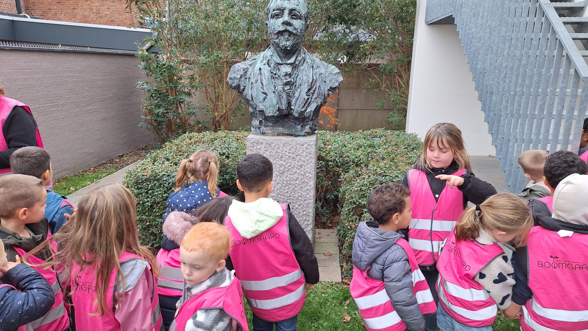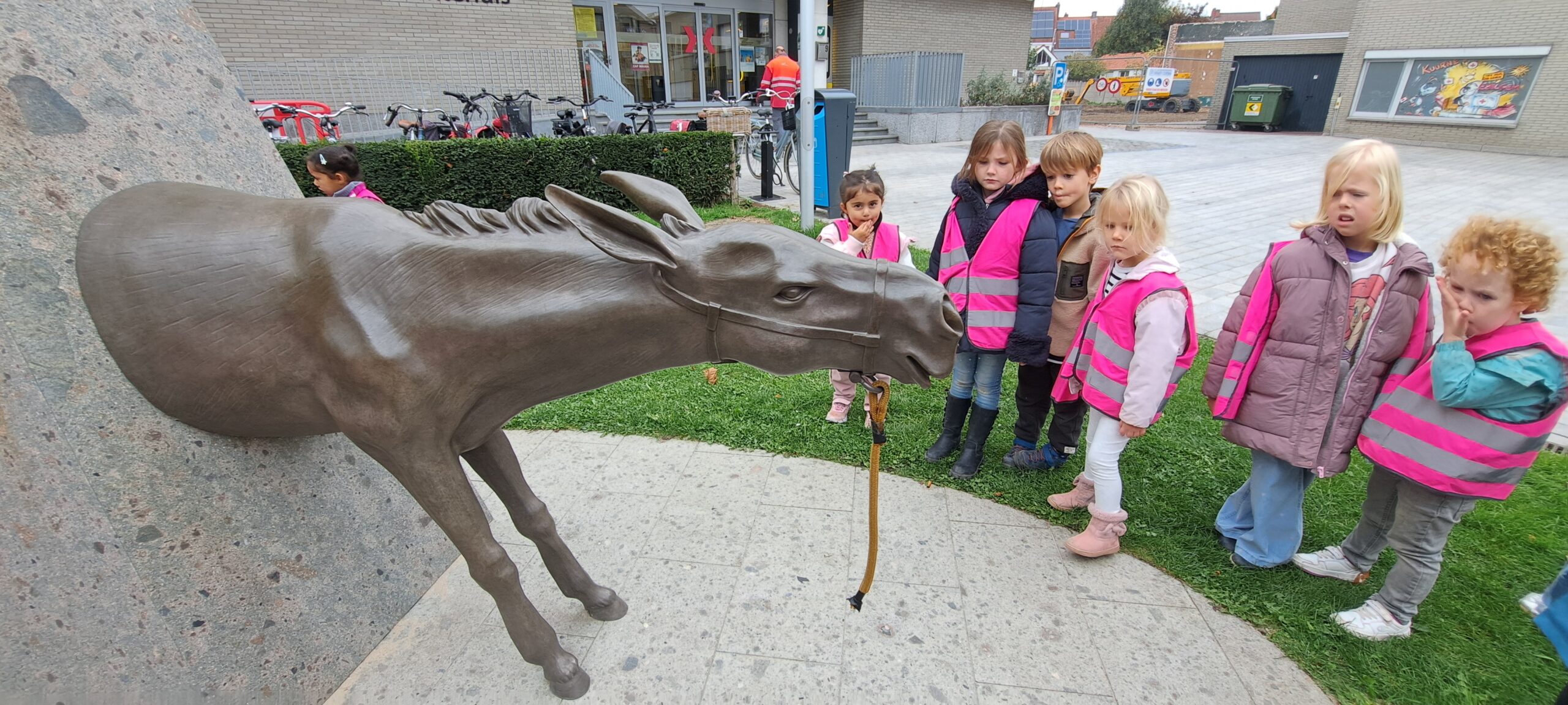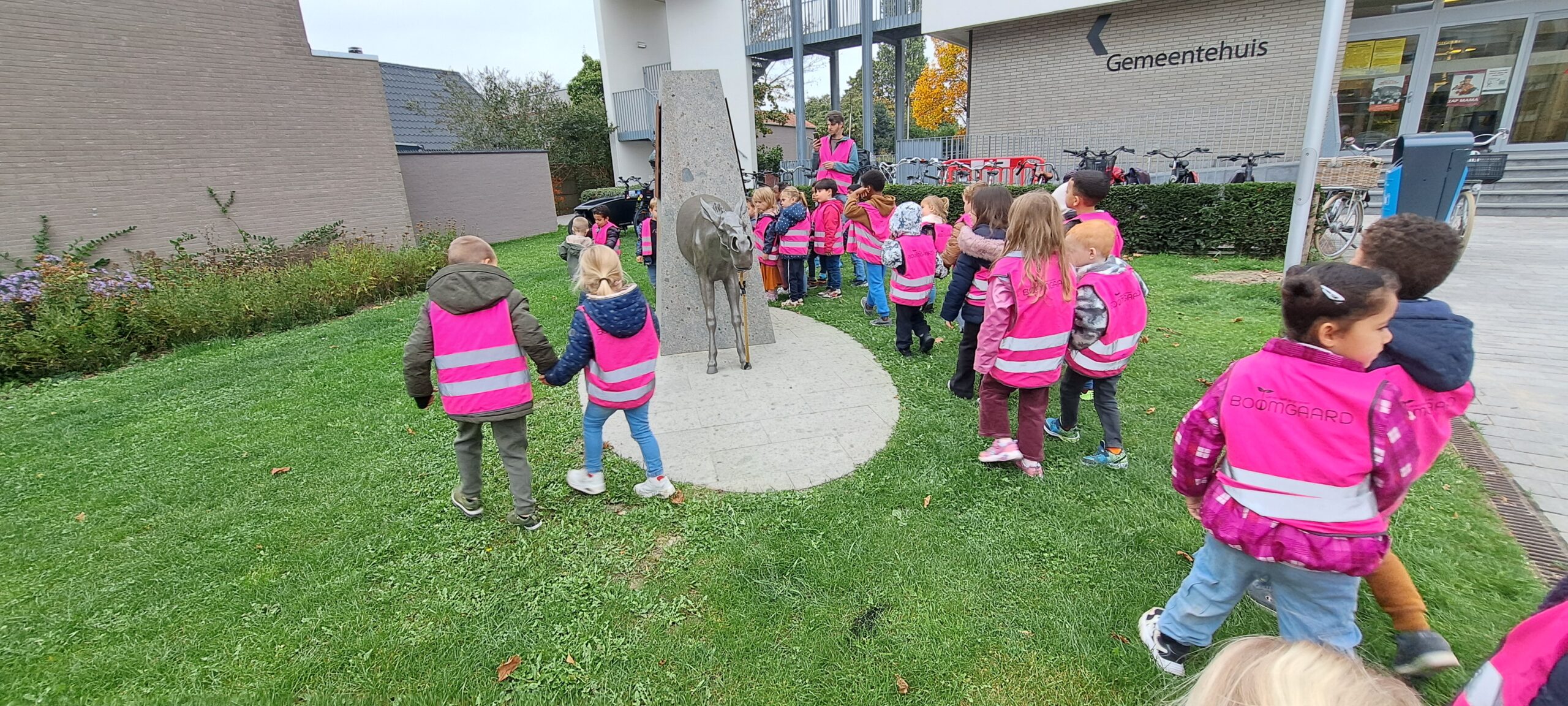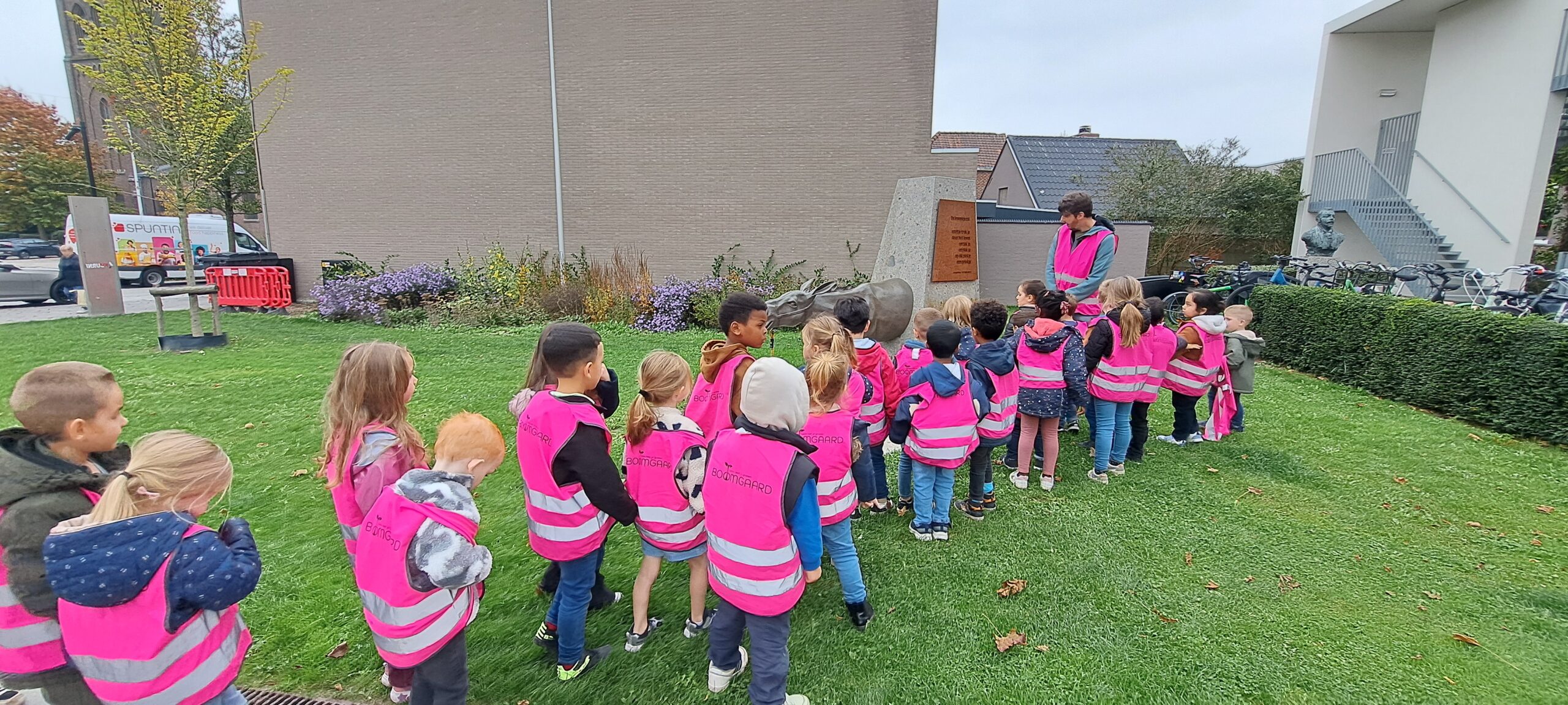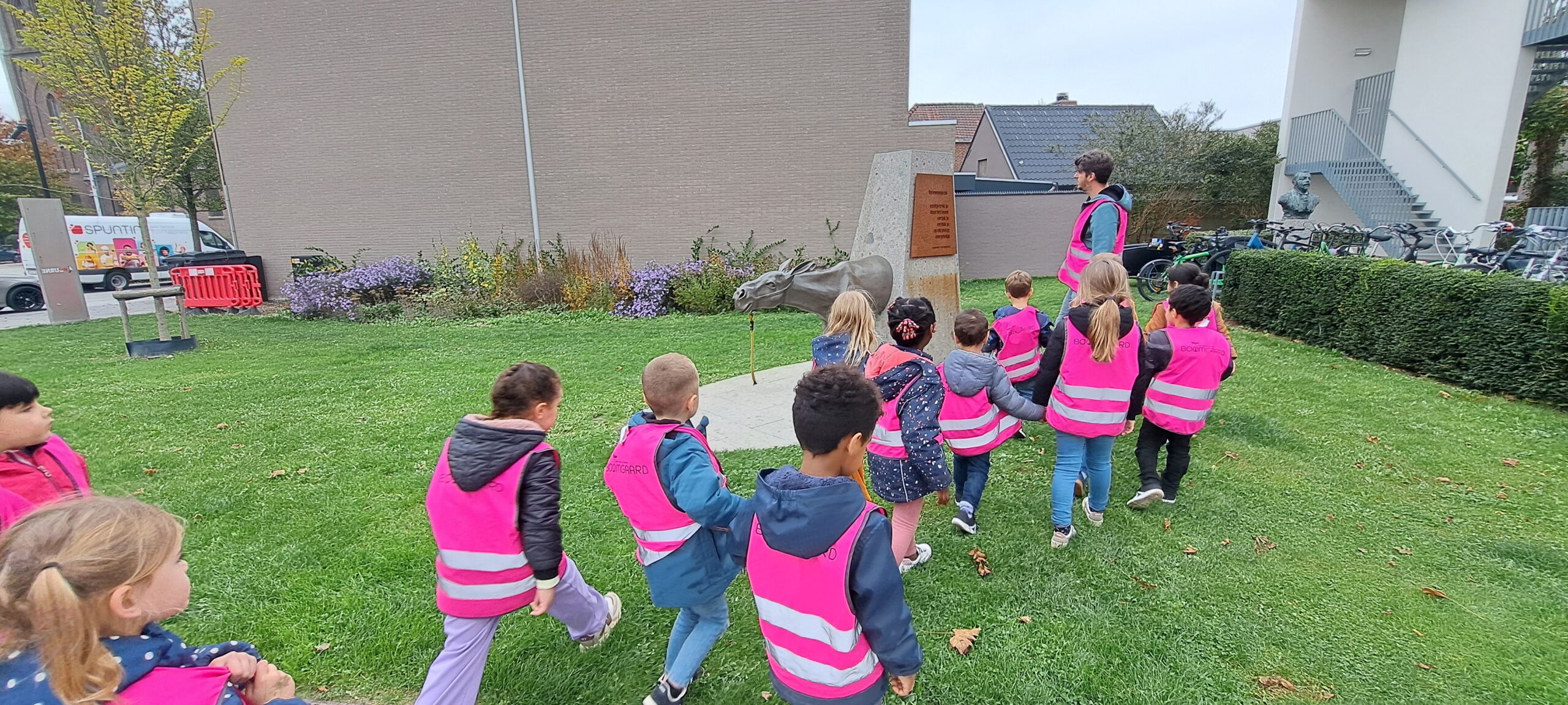 Op dinsdagvoormiddag gingen we op stap in onze gemeente. Want ook langs de straat zie je kunst! We hebben schilderwerken gezien op muren, op hout, op vensters. We konden ook enkele beelden waarnemen en die waren gemaakt uit verschillende materialen: hout of metaal. We leerden tijdens deze wandeling ook het verschil tussen kunstwerken en grote reclameborden die aan de muren hangen.